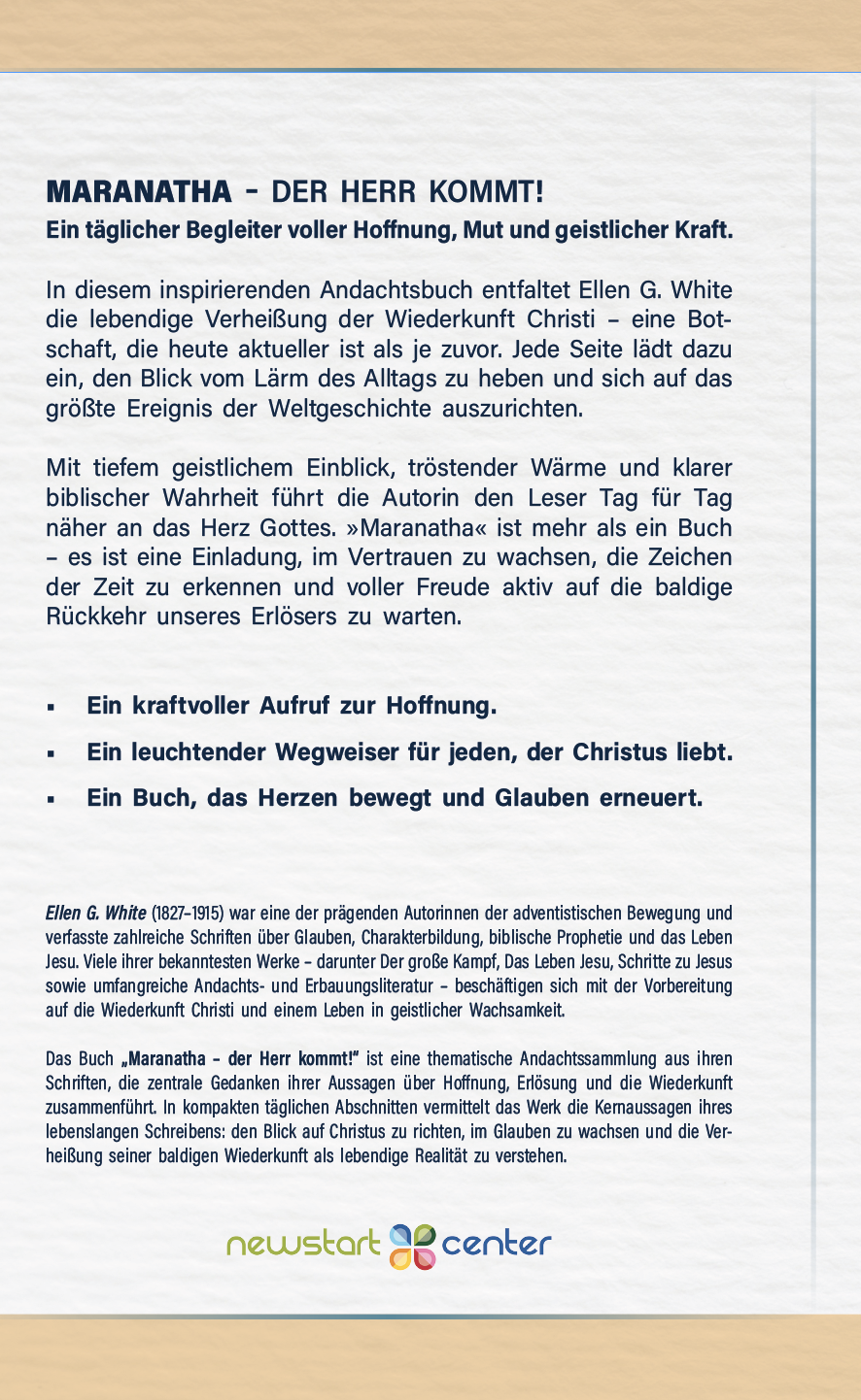 Das Buch „Maranatha – der Herr kommt!“ ist eine thematische Andachtssammlung aus ihren Schriften, die zentrale Gedanken ihrer Aussagen über Hoffnung, Erlösung und die Wiederkunft zusammenführt. In kompakten täglichen Abschnitten vermittelt das Werk die Kernaussagen ihres lebenslangen Schreibens: den Blick auf Christus zu richten, im Glauben zu wachsen und die Verheißung seiner baldigen Wiederkunft als lebendige Realität zu verstehen.