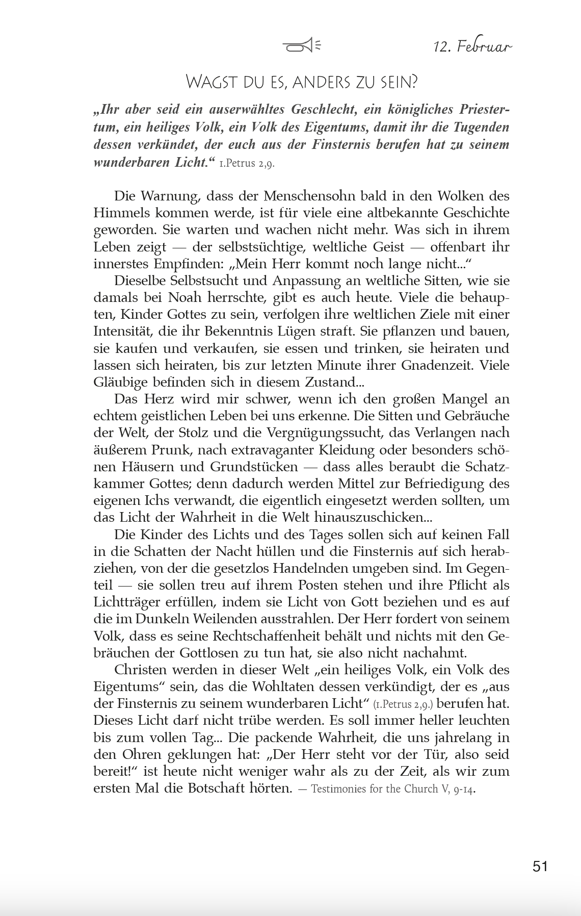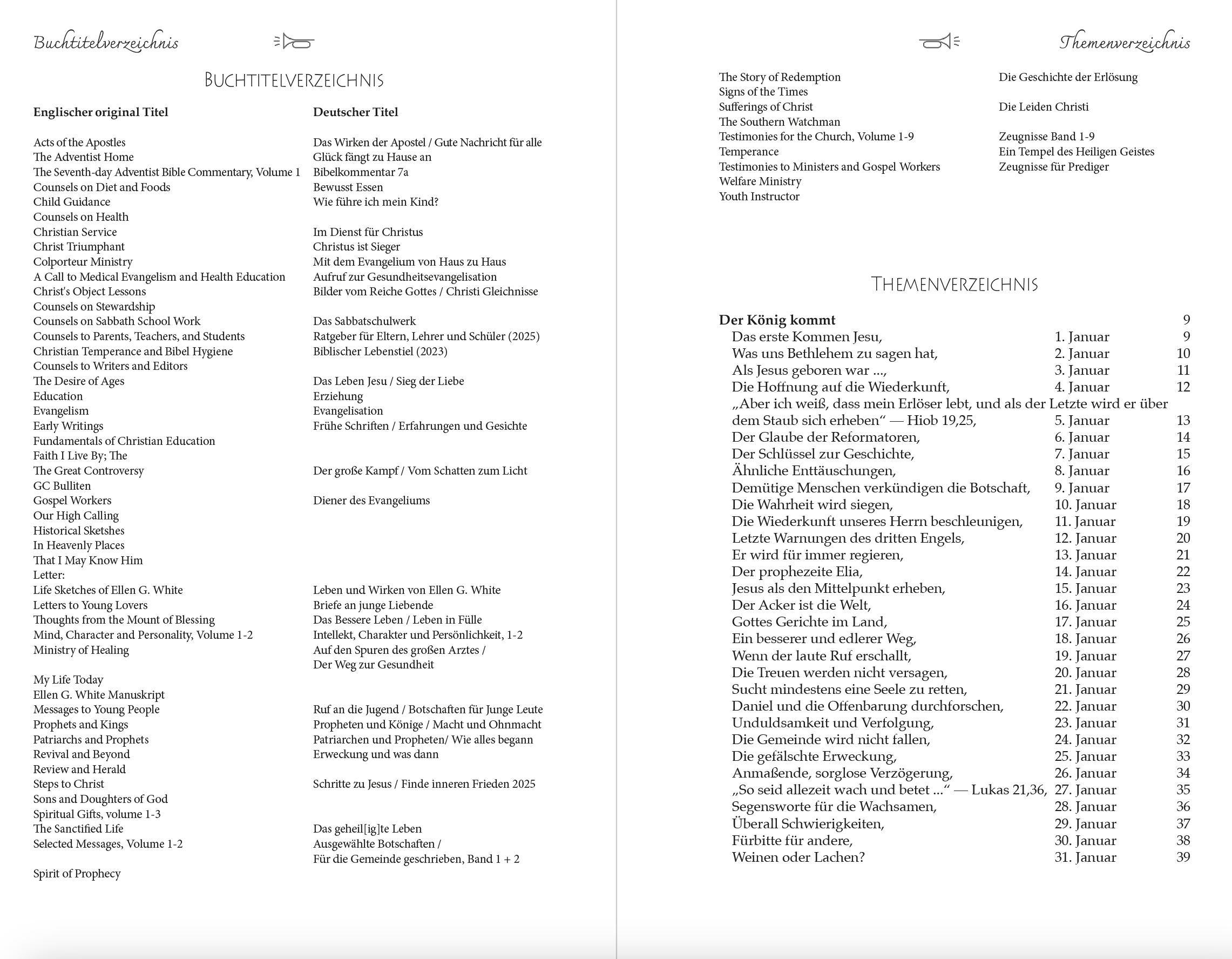 Ellen G. White (1827–1915) war eine der prägenden Autorinnen der adventistischen Bewegung und verfasste zahlreiche Schriften über Glauben, Charakterbildung, biblische Prophetie und das Leben Jesu. Viele ihrer bekanntesten Werke – darunter Der große Kampf, Das Leben Jesu, Schritte zu Jesus sowie umfangreiche Andachts- und Erbauungsliteratur – beschäftigen sich mit der Vorbereitung auf die Wiederkunft Christi und einem Leben in geistlicher Wachsamkeit.