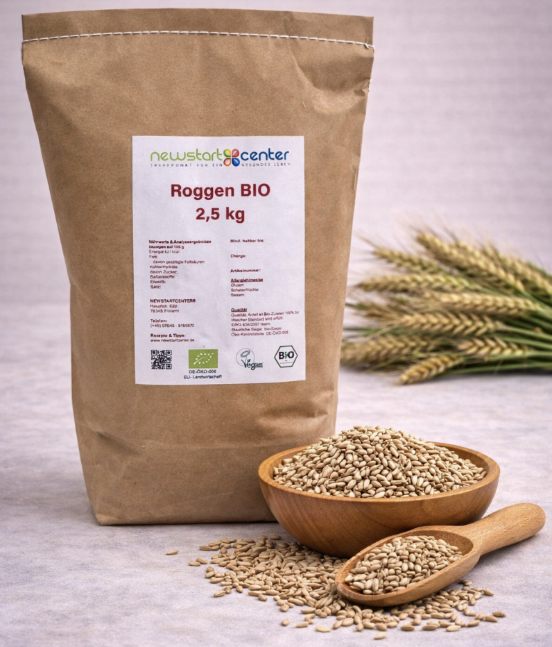 | Besonder- heiten: | Roggen ist neben Weizen das wohl wichtigste Brotgetreide. Durch den Sauerteig erlangt er seine Backfähigkeit. Roggen enthält Lysin, einen wichtigen Baustein für den Knochenwachstum und zur Stärkung des Immunsystems.Frei von Hefe, Lactose, Kuhmilch, Soja und Ei. | |