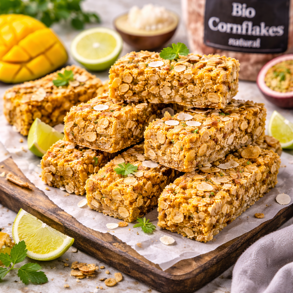 Dry Mix: Cornflakes grob zerdrücken. Mit Kokos, Nüssen/Kernen, Trockenfrucht, Salz (und optional Zimt/Limettenabrieb) mischen.