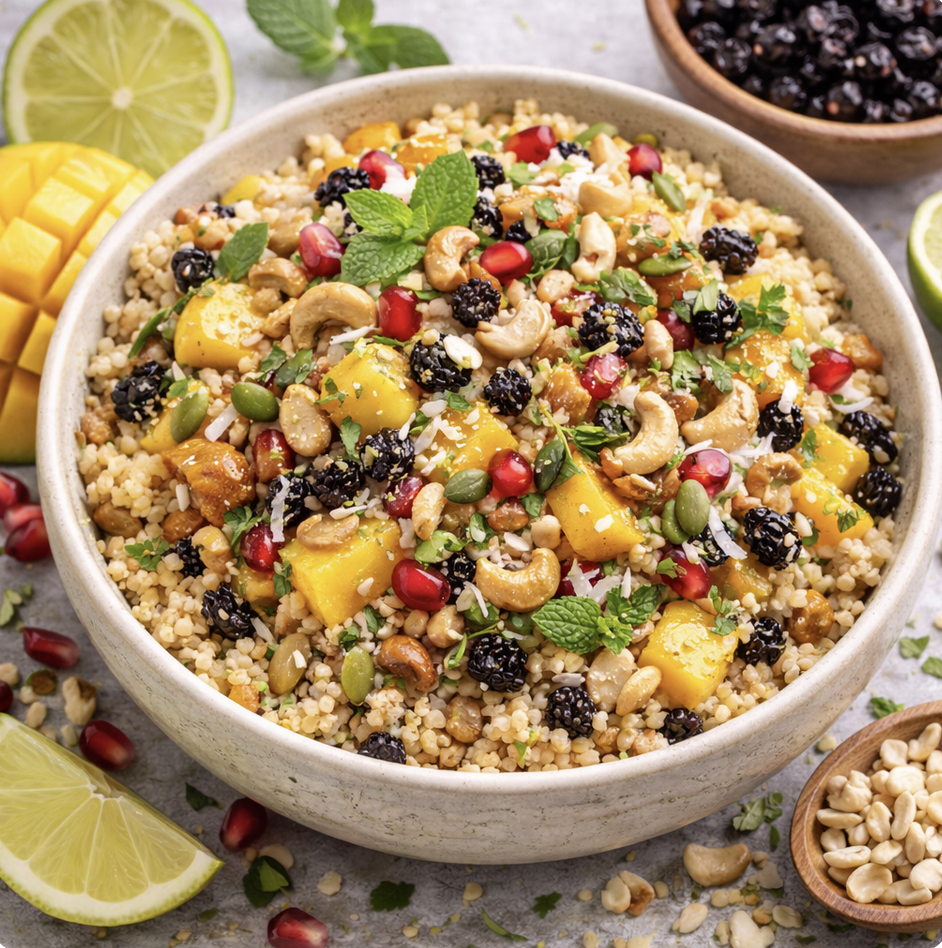 Ein paar Granatapfelkerne oder ein Löffel Passionsfrucht oben drauf – passt genial zu Korinthen & Mango.