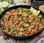 Anrichten: Kokos-Reis in Schüsseln, Gemüse-Sultaninen-Mix drauf. Mit Frühlingszwiebeln, Sesam, Kräutern und Limette dekorieren.