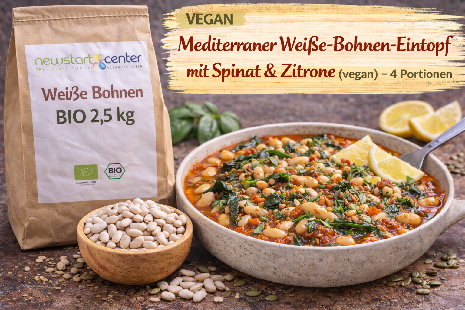 Mediterraner Weiße-Bohnen-Eintopf mit Spinat & Zitrone (vegan) – 4 Portionen