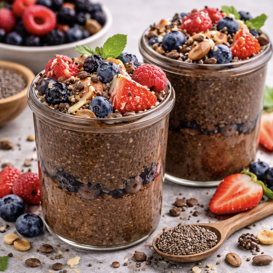 Proteinreicher Chia-„Pudding“ mit Kakao & Beeren (vegan) – mit schwarzen Bio-Chiasamen (Rohkost)