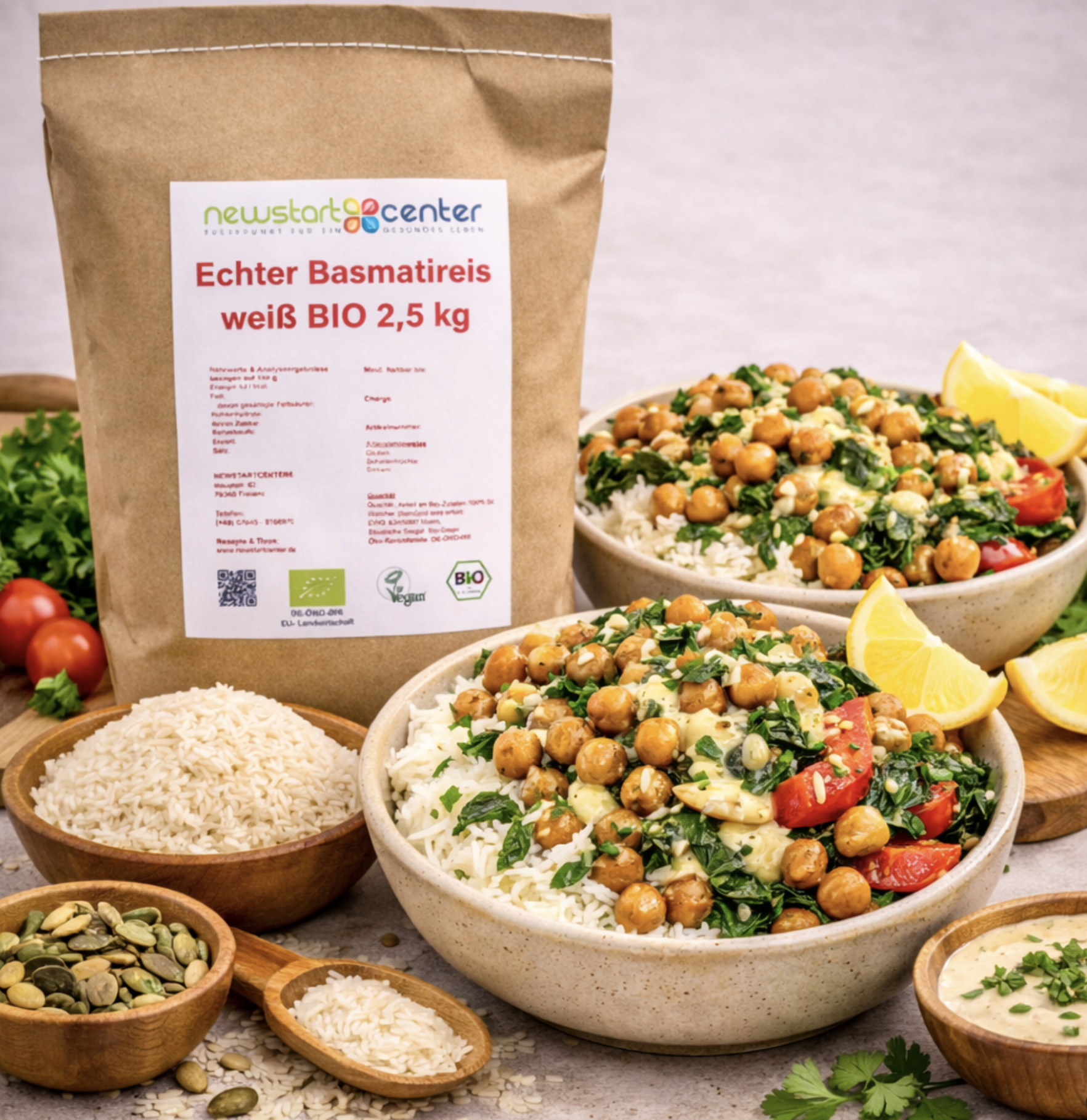 Duftender Bio-Basmati-Reis mit Kichererbsen, Spinat & Zitronen-Tahini (vegan) – 2 Portionen