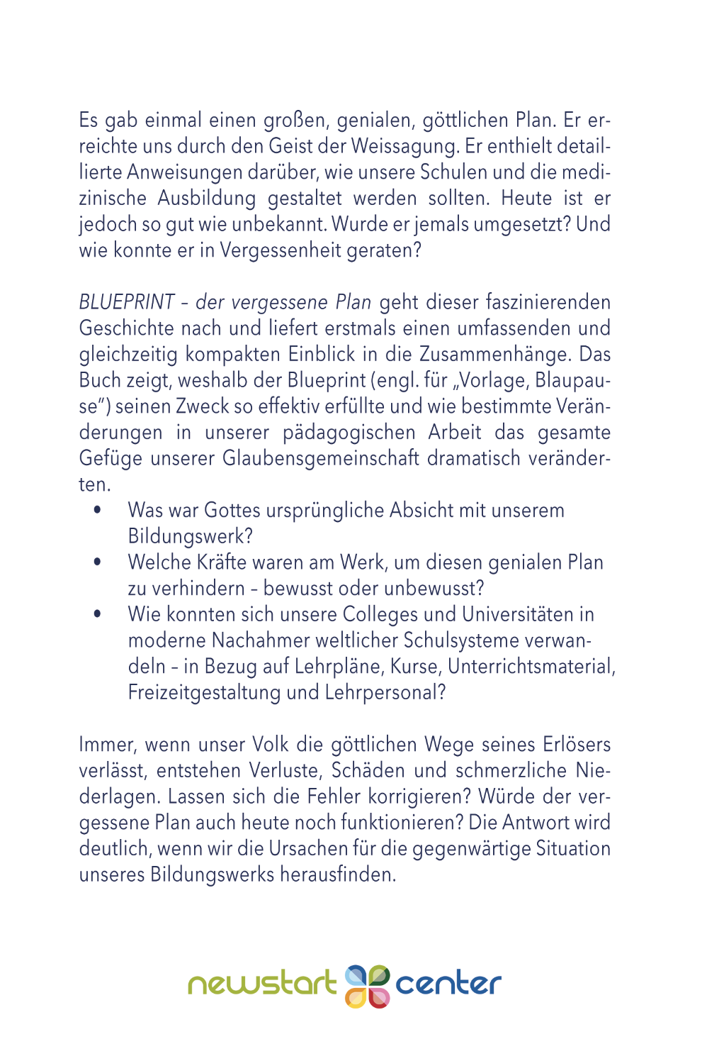 BLUEPRINT – der vergessene Plan geht einer faszinierenden Geschichte nach und liefert zum ersten Mal einen umfassenden und gleichzeitig kompakten Einblick in die Zusammenhänge. Das Buch zeigt, weshalb der Blueprint (engl. für „Vorlage, Blaupause“) seinen Zweck so effektiv erfüllte und wie bestimmte Veränderungen in unserer pädagogischen Arbeit das gesamte Gefüge unserer Glaubensgemeinschaft dramatisch veränderten.