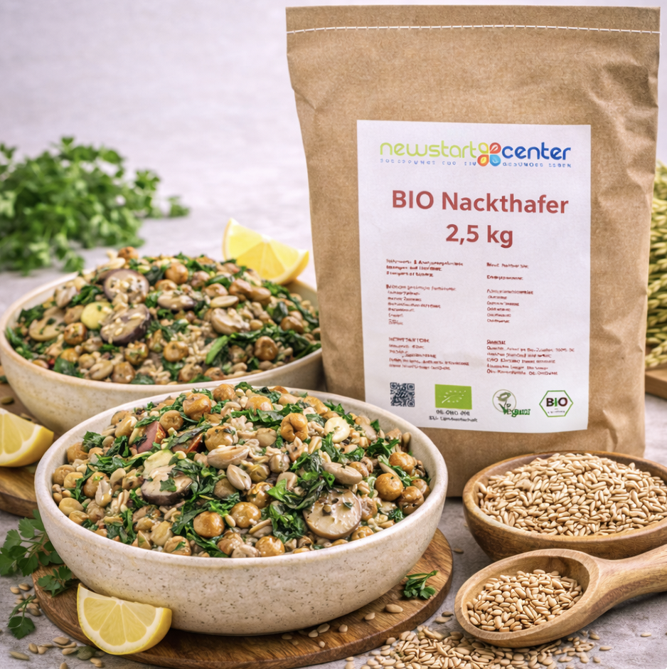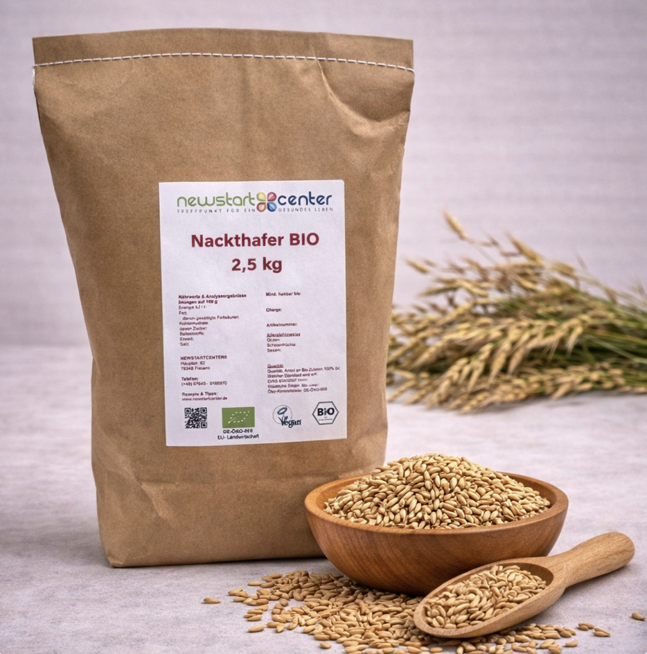Nackt-Hafer ist eine nahezu spelzenfreie Züchtung, die sowohl die wertvollen Inhaltsstoffe, als auch die Keimfähigkeit bewahrt. Er ist sehr nähr- und wirkstoffreich und mild-aromatisch im Geschmack.Frei von Hefe, Lactose, Kuhmilch, Soja und Ei.