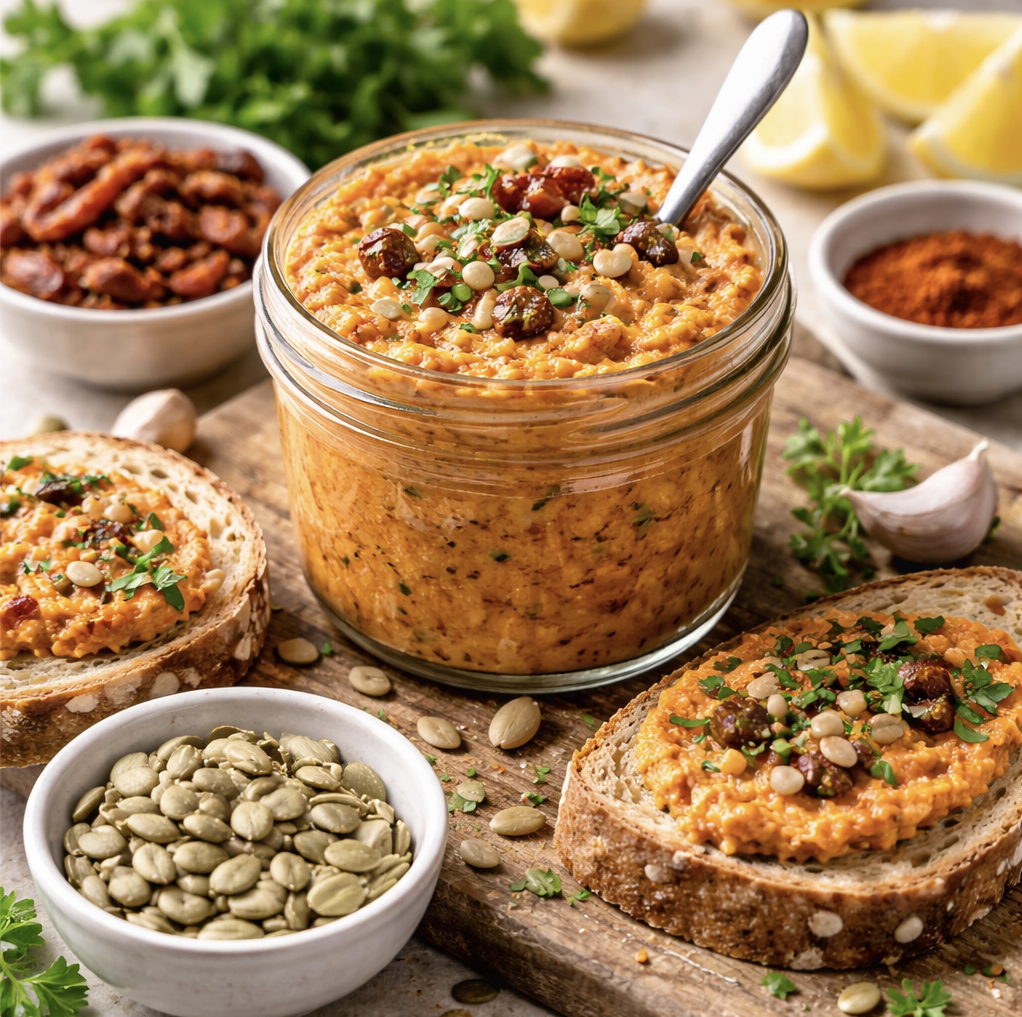 3. Mixen: Geröstete Kerne, Zwiebel-Knoblauch, getrocknete Tomaten, Tomatenmark, Zitronensaft/Essig, Gewürze, Salz (und optional Senf/Hefeflocken) in einen Mixer/Multizerkleinerer geben.